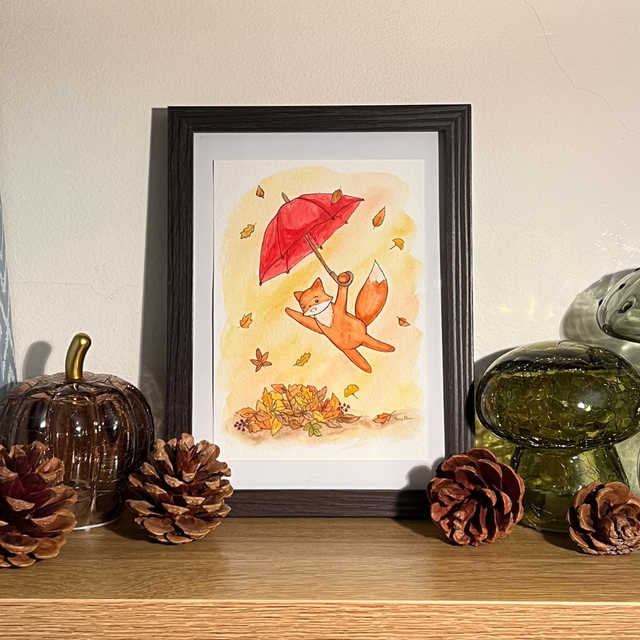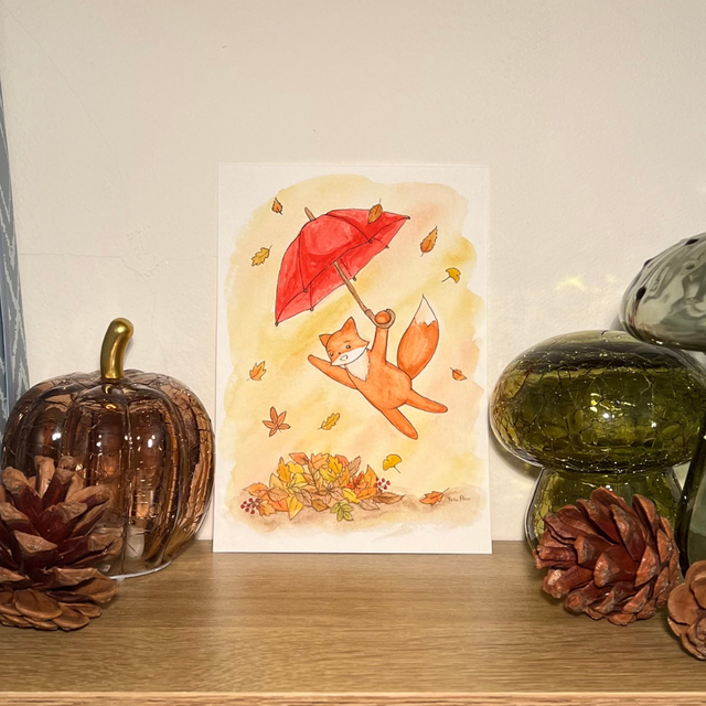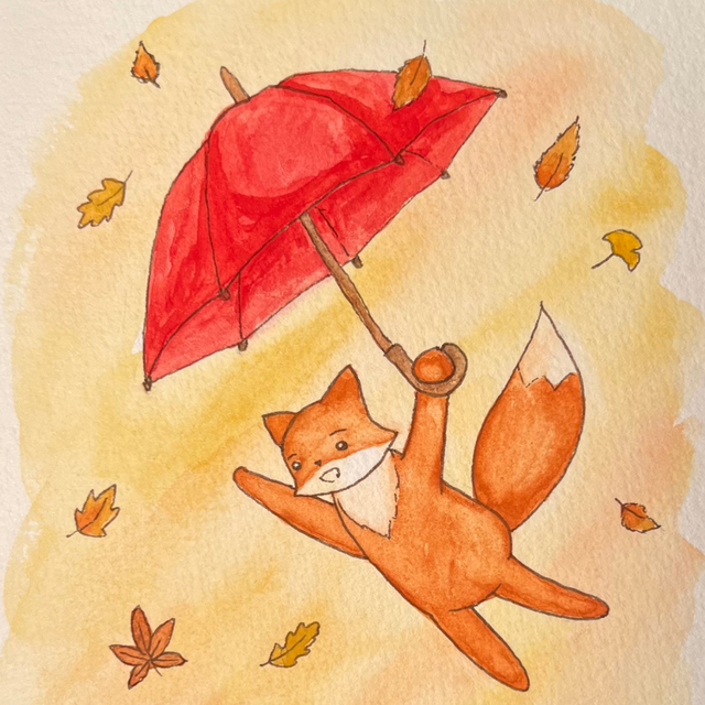 Aki s’élance dans l’air, emporté par son parapluie rouge. Les feuilles tourbillonnent autour de lui, et l’air léger accompagne ses rires, transformant l’automne en une danse joyeuse et aérienne.