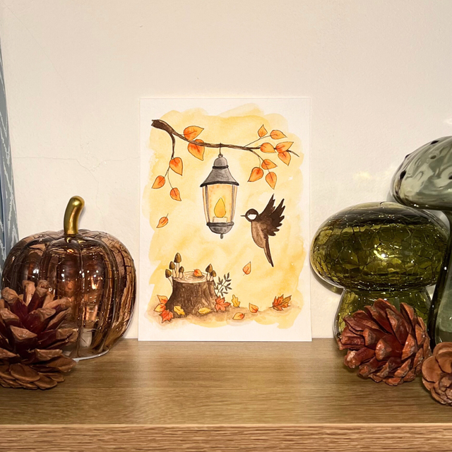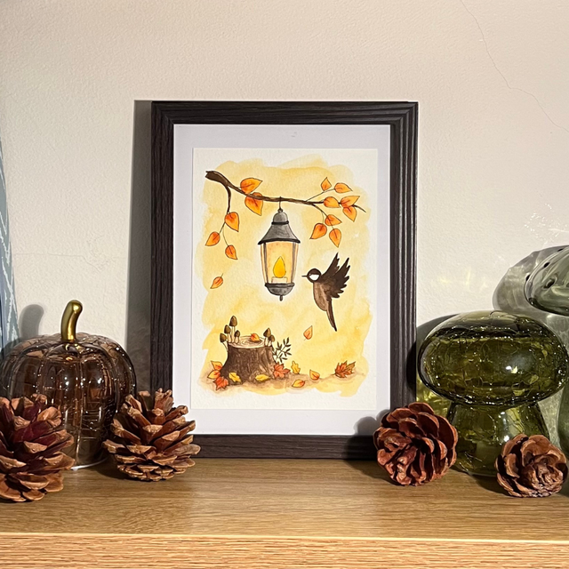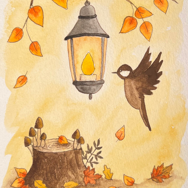 Dans la douceur dorée de l’automne, une lanterne suspendue diffuse sa lumière chaleureuse. Mio vole à ses côtés, observant attentivement la scène, comme émerveillé par la magie qui l’entoure.